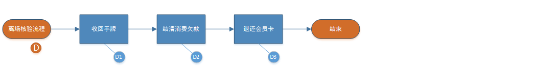 1、前台客服在“离场签到”中,查找会员的入场记录,检查手牌号是否正确,储值账户是否欠款(若欠款,需补足欠款),然后标记离场。